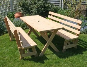 Product Description : : Our 27" Cedar Backyard Bash Cross-Legged Picnic Table with Backed Benches makes it easy for you to enjoy all of the tastes of summer. After you're stuffed with cheeseburgers, hot dogs, potato salad, and countless desserts, you can lean back and relax without leaving the table. And even if it takes awhile to get the strength to walk away, don't worry, because its construction from durable, decay-resistant Red Cedar will let it hold you up for a long, long time. Table: 27"W x 30"H. Tabletop: 1.375" Thick. Table Legs: 25"W. Bench: 24"D x 34"H. Bench Seating: 14"D x 18"H. Bench Legs: 18"W. Bench Back: 16.5"H. Supports: 3.5" Thick. Bench Capacity (ea): 675 lbs. Set Includes: Cross Legged Table and Traditional Backed Benches. Features: Optional Cedar Stain/Sealer - Add'l 28% Fee. Rounded & Sanded Edges. Option of 2" Umbrella Hole. Made in the U.S.A.