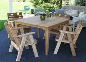 Product Description : : Make every outdoor dining experience romantic with this Country Hearts Dining Set. Heart accents on the four patio dining chairs add a subtle touch of country elegance, while the high quality square outdoor dining table keeps the entire patio dining set grounded. Luminous red cedar makes it a backyard staple. Table Overall: 47"W x 47"L x 31"H. Chair Overall (ea): 28.5"W x 25"D x 38"H. Seat & Back: 21.5"W x 20"D x 22"H. Table Weight: 50 lbs. Chair Weight (ea): 30 lbs. Chair Capacity (ea): 390 lbs. Set Includes: Table and 4 Chairs. Features: Optional Cedar Stain/Sealer - Add'l 28% Fee. Rounded & Sanded Edges. Option of 2" Umbrella Hole. Made in the U.S.A.