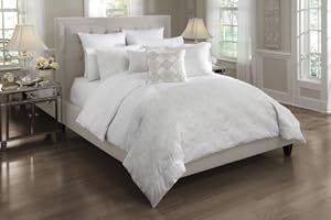 Product Description : : Size: KingCroscill's "White Label" is a refined collection of sophisticated designs created with luxurious fabrics and exquisite trims and details. Camille ensemble gleams with elegance, effortlessly adding a sophisticated style to any bedroom. A soft beige damask jacquard stretches gracefully across the bottom area of the crisp white comforter. This subtle jacquard area is bordered with a decorative hemstitch on the top and bottom. Jacquard shams, square pillow and boudoir pillow feature the same damask pattern as seen in the comforter, with the square pillow adding a solid white flange accent. The fashion pillow makes a bold statement with a metallic bronze medallion pattern embroidered upon a crisp white ground. The euro shams are of solid white, left without embellishment to maintain the simplicity of the ensemble. Also available, 100-percent cotton sheets with coordinating decorative hemstitch accents to complete the collection.