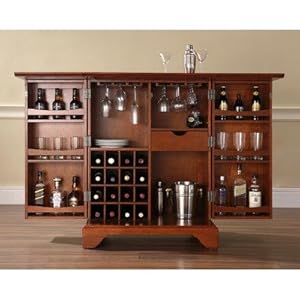 Product Description : Finish:Classic Cherry Constructed of solid hardwood and wood veneers, this expandable bar cabinet is designed for longevity. The beautiful raised panel doors provide the ultimate in style to dress up your home. The doors open and top folds out to double the size of your entertaining/serving area Inside the doors, you will find plentiful storage space for spirits, glassware, and a host of other bar items The center cabinet features 16 bottle wine storage, utility drawer, hanging stemware storage, and extra space for a variety of other barware Expands to 62.5' wide when open Hand rubbed; Multi-Step finish